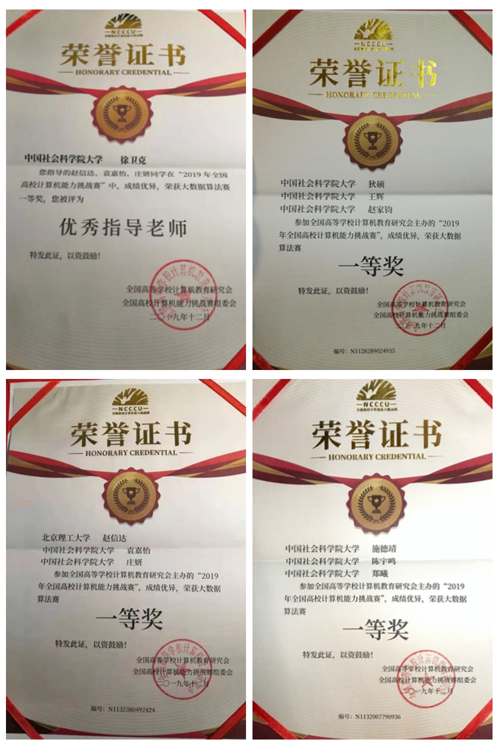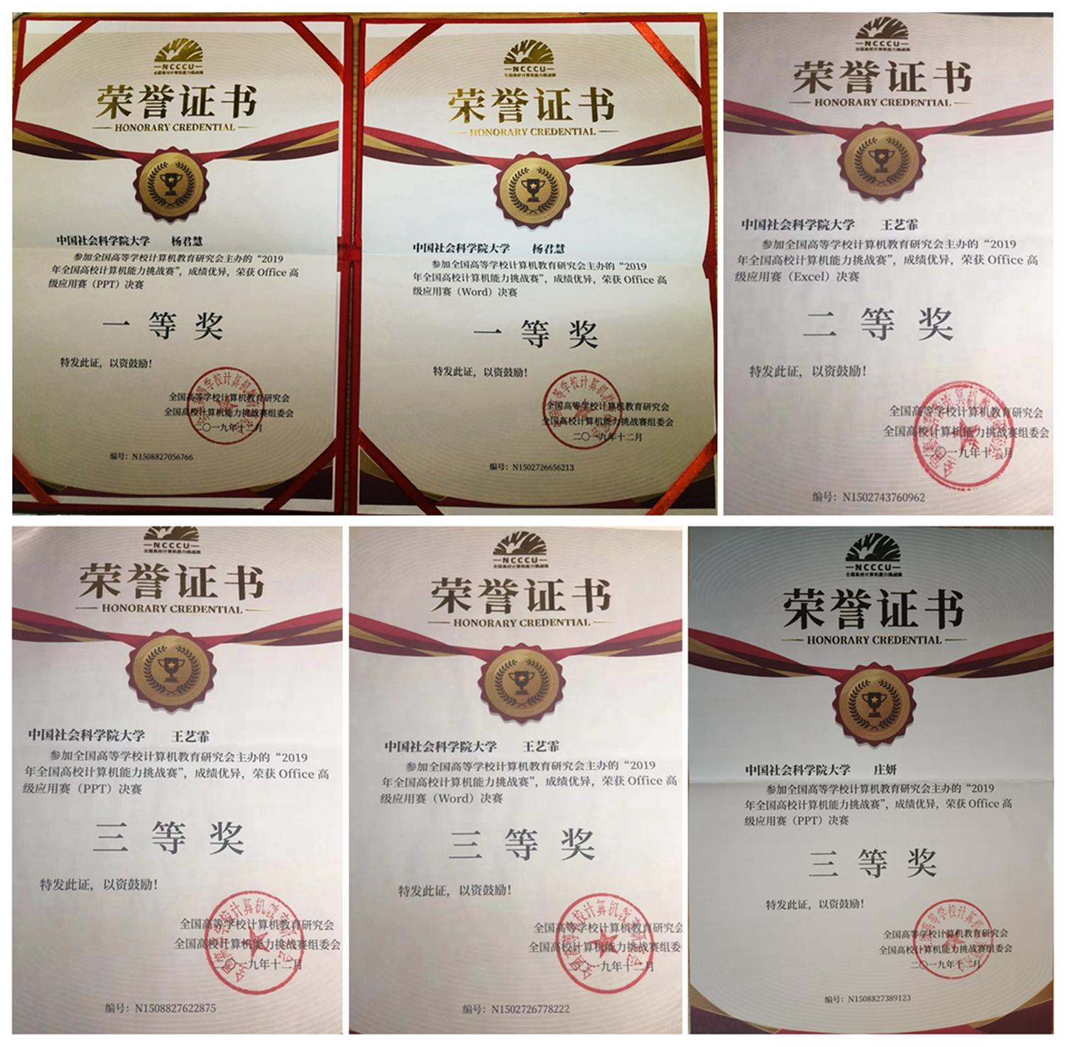参赛队一举摘取全国决赛5个一等奖、1个二等奖和3个三等奖。大数据算法赛获一等奖的3支队伍为施德靖、陈宇鸣、郑曦团队,狄硕、王辉、赵家鈞团队和赵信达(北理工)、袁嘉怡、庄妍团队。Office高级应用赛获一等奖的为杨君慧,获二等奖的为王艺霏,获三等奖的为庄妍。徐卫克获优秀指导教师奖。