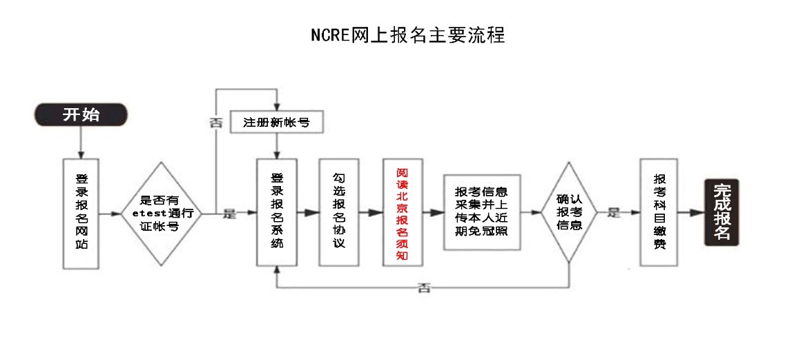 北京考生登录全国计算机等级考试报名网站(网址://ncre-bm.neea.cn),点击“(11)北京市”报名入口进行网上报名。考生若已有账号,可直接登录报名;若没有账号,需通过“ETEST通行证”网站进行注册。考生登录报名网站后,须首先阅读“省通告:北京市NCRE报名须知”等公告,知悉并遵照相关要求,按照网页提示完成信息填写、照片上传和缴费。