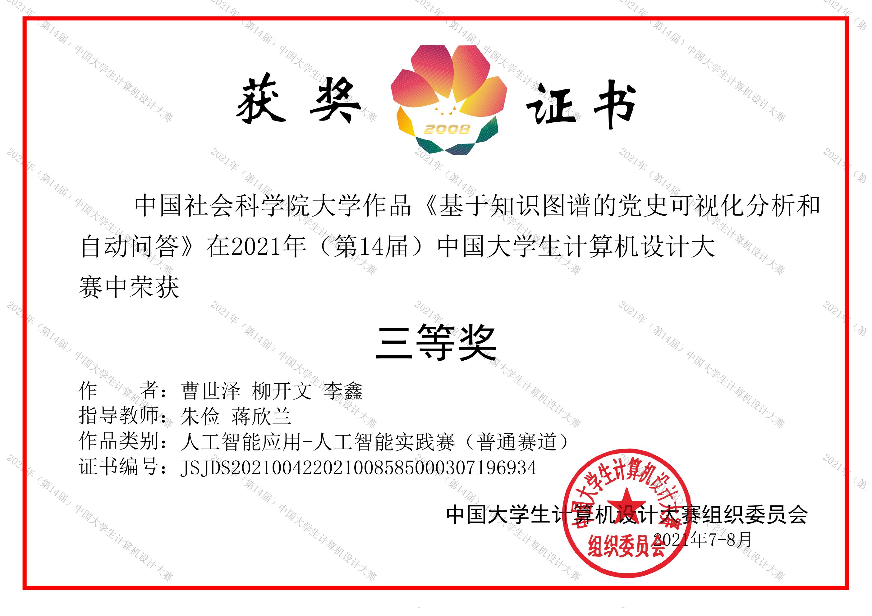 朱俭、蒋欣兰老师的指导下,作品“基于知识图谱的我国党史知识库构建研究可视化分析”在“人工智能实践赛”赛道上荣膺全国三等奖。