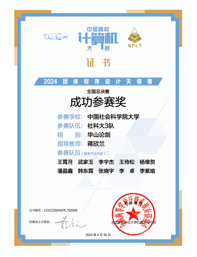 蒋欣兰担任指导老师,组织了3支队伍30名本科生参赛(参赛语言C、C++、Python,参赛学生是:张良鹏、李鑫、马欣颖、陈泰翱、王瑞琪、周祎凡、郭阳铭、崔思婷、张钧皓、李清逸、周欣潼、杨嘉诚、黄天勇、杜婉婷、王晔、陈心仪、王胤杰、韩登清、周娅兰、马业腾、王霄月、武家玉、李宇杰、王侍松、杨维贺、潘晶鑫、韩东霖、张晓宇、李卓、李紫瑜),3支队伍只获成功参赛奖。本次比赛题目难度超以往各届题目,未有斩获,下次再接再厉。