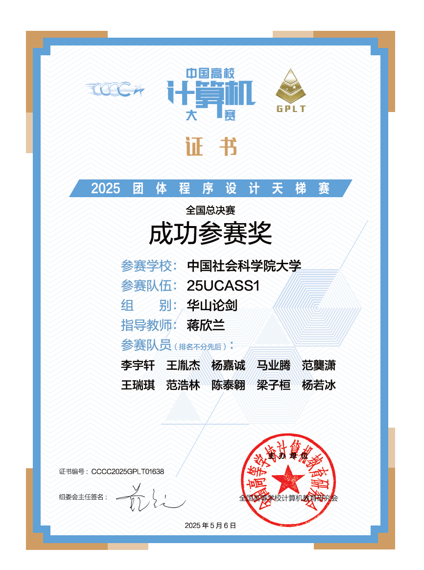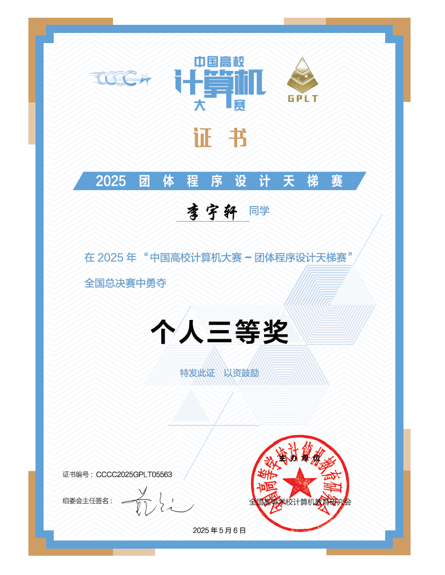 蒋欣兰担任指导老师,组织了2支队伍20名本科生参赛(参赛语言C、C++、Python,参赛学生是:杨嘉诚、陈泰翱、马业腾、王胤杰、范龑潇、杨若冰、王瑞琪、李宇轩、陈心仪、吴泓洁、范浩林、李卓、黄琬婷、王侍松、李宇杰、武家玉、何尊祺、梁子桓、周欣潼、张良鹏),2支队伍获成功参赛奖,李宇轩同学获全国个人三等奖,这是学校有史以来除了陈宇鸣之外第二次拿到全国个人三等奖,非常难。