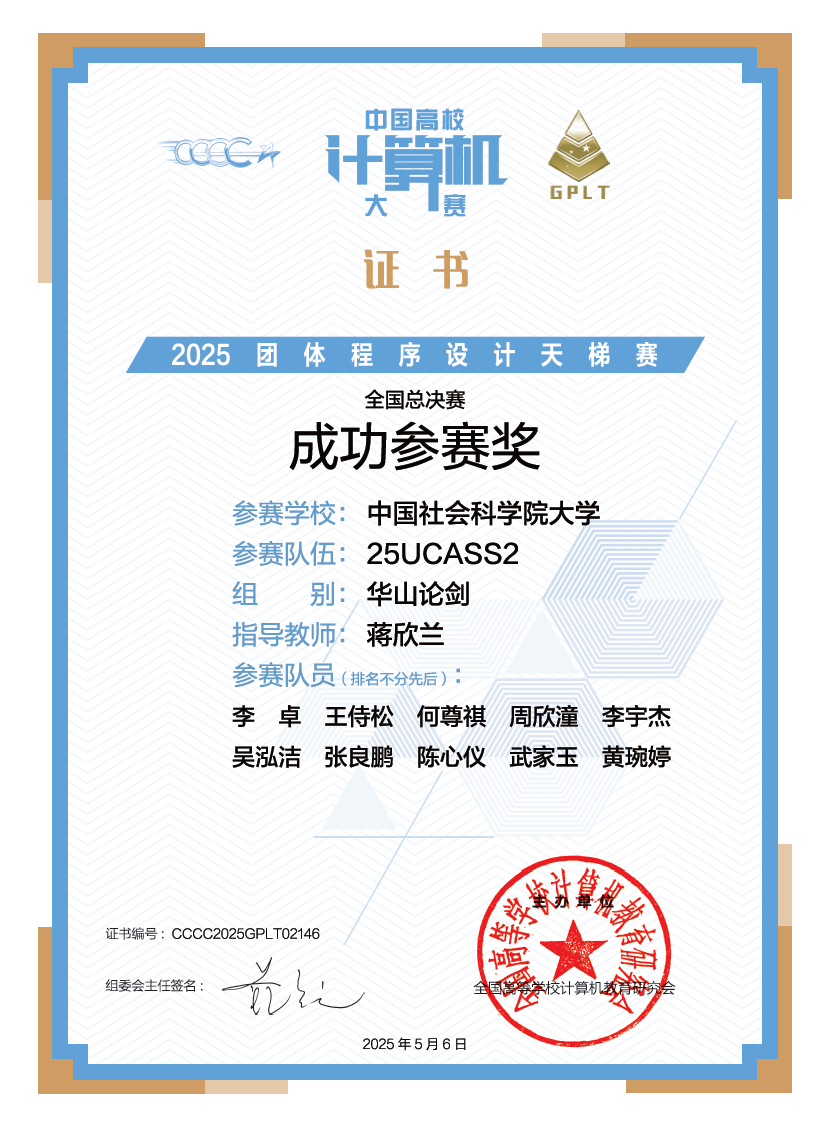 蒋欣兰担任指导老师,组织了2支队伍20名本科生参赛(参赛语言C、C++、Python,参赛学生是:杨嘉诚、陈泰翱、马业腾、王胤杰、范龑潇、杨若冰、王瑞琪、李宇轩、陈心仪、吴泓洁、范浩林、李卓、黄琬婷、王侍松、李宇杰、武家玉、何尊祺、梁子桓、周欣潼、张良鹏),2支队伍获成功参赛奖,李宇轩同学获全国个人三等奖,这是学校有史以来除了陈宇鸣之外第二次拿到全国个人三等奖,非常难。